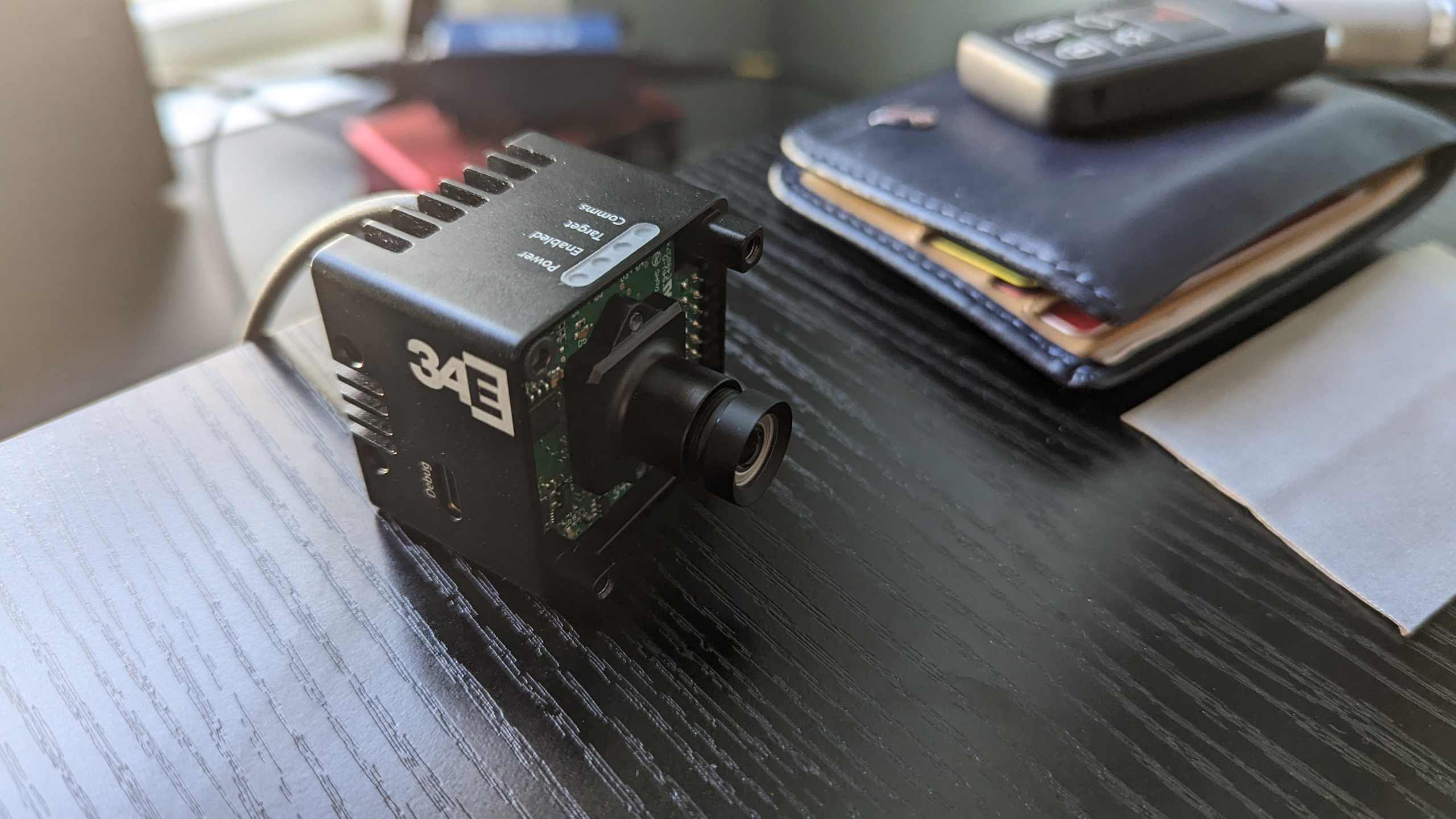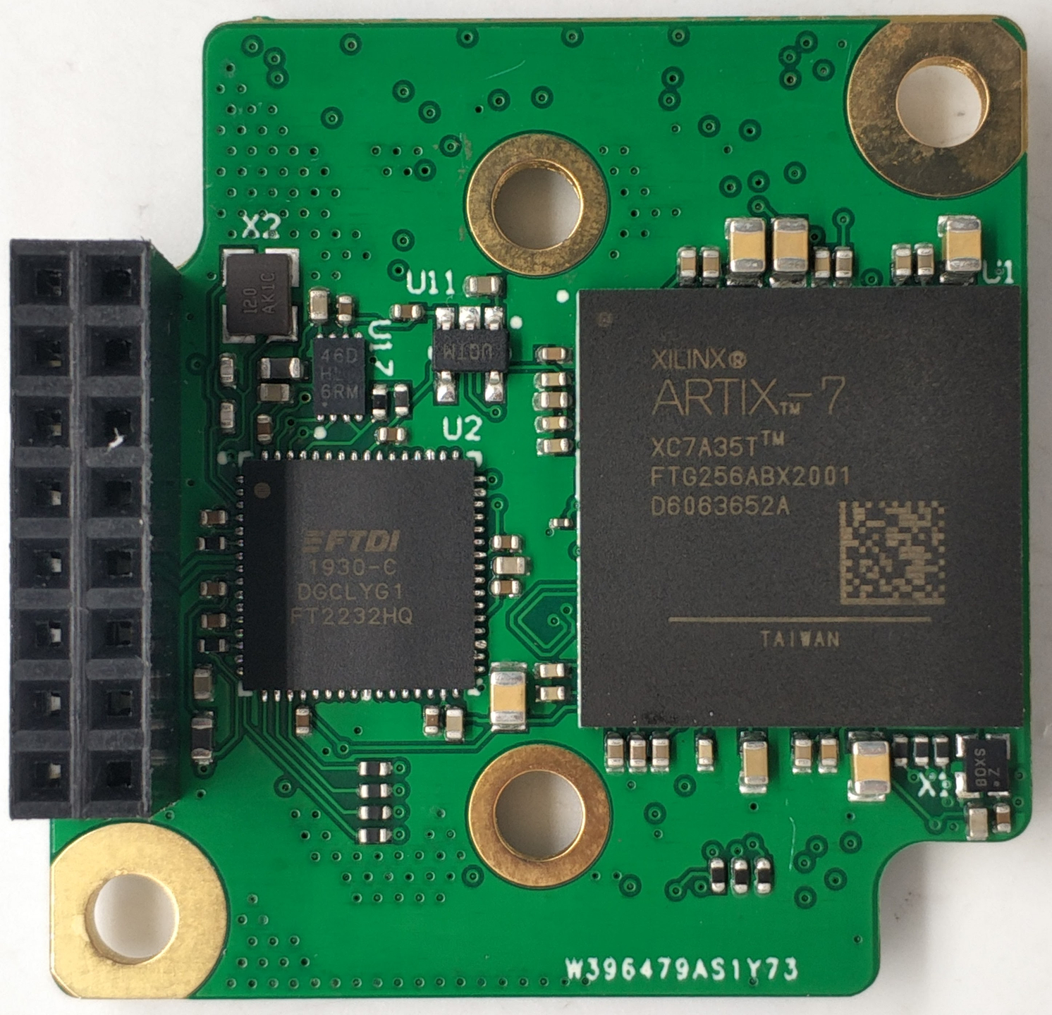 The hardware consisted of a compact 1.5″ x 2″ eight-layer PCB integrating an Artix-7 FPGA (XC7A35T), FTDI USB chip, and Onsemi image sensor.